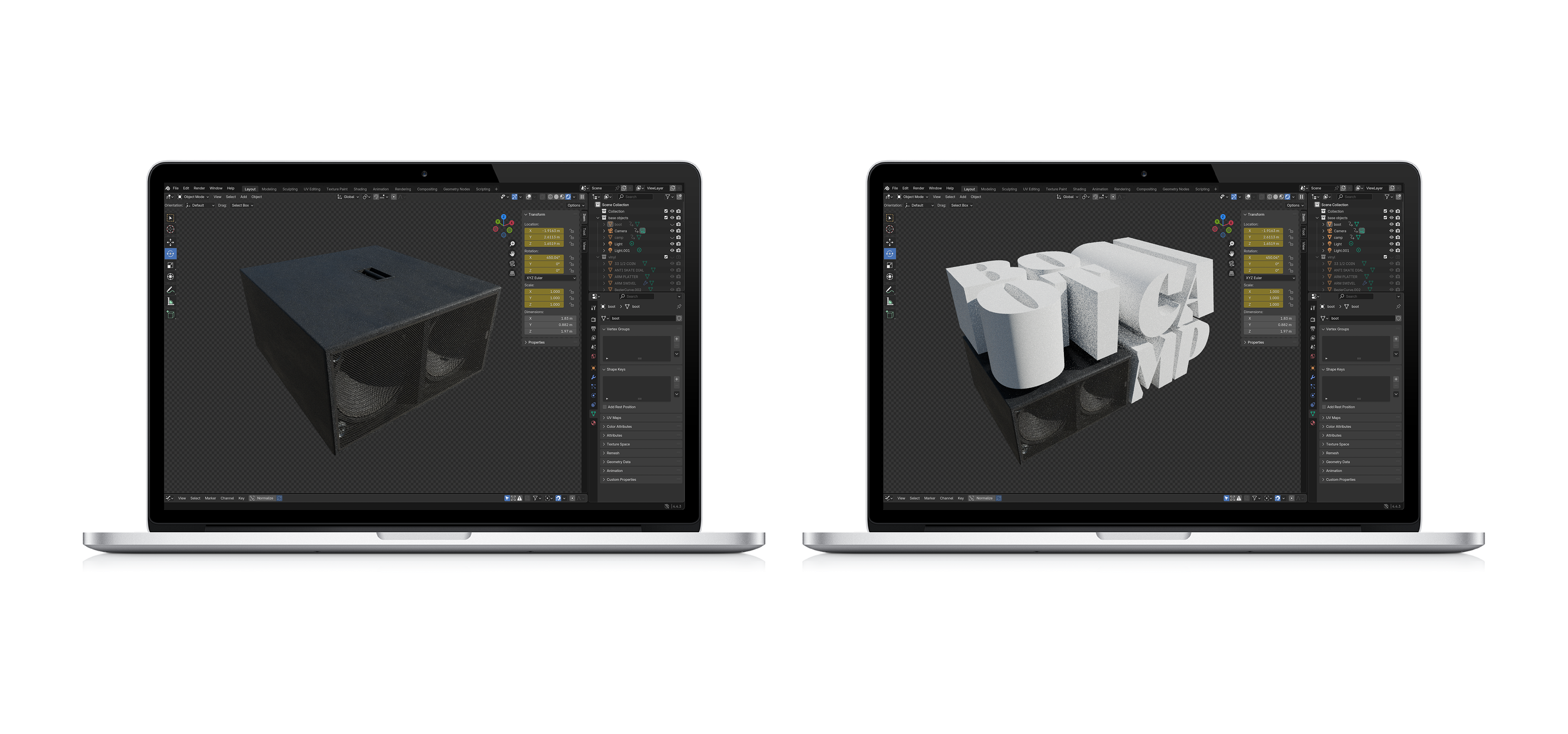 - 3D Visual Design: Modeling and rendering a custom type object resting on a speaker (created in Blender).